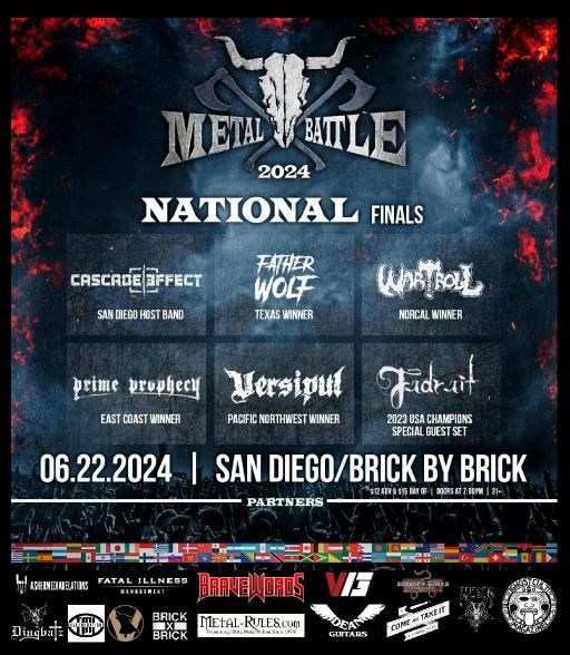 These final five bands will meet in San Diego, CA on June 22nd at the Brick By Brick with special guest headliners, 2023 WMBU champions Fadrait (Live video at Wacken Open Air - ). Each competing band will be judged by a panel of music industry professionals where one will be crowned the 2024 champion and move on to perform as the only independent American band at the International Battle at Wacken Open Air (July 31st – August 3rd), one of the world's most prestigious and largest metal festivals (Attendance of over 80,000 people in Wacken, Germany for over 30 years).